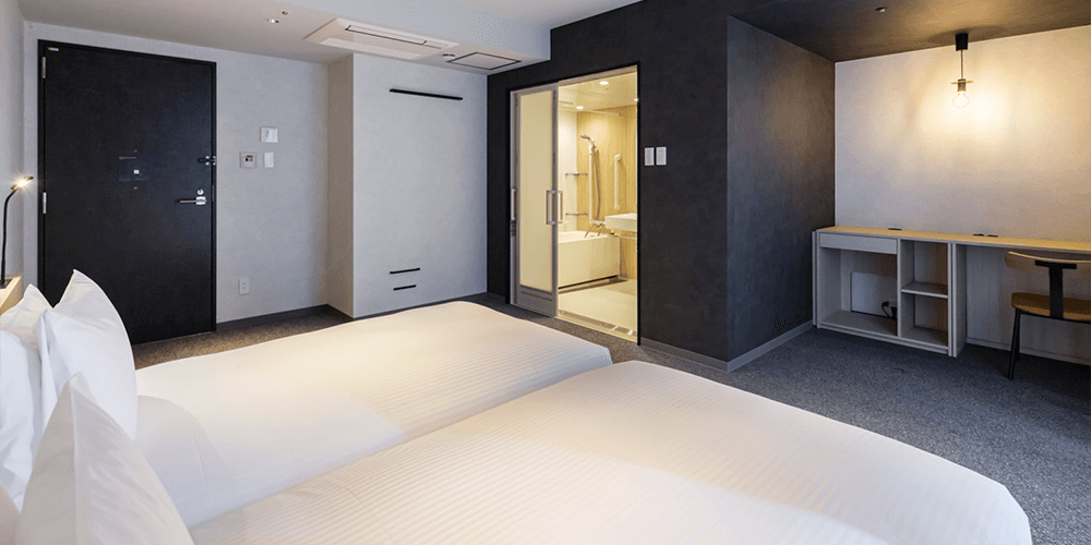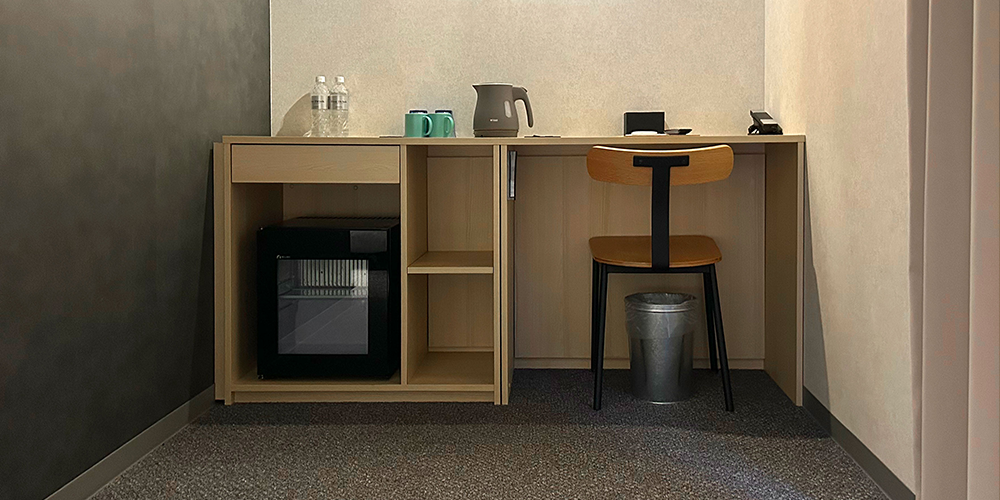 There are no steps inside the room, so elderly people and wheelchair users can stay comfortably. There is a desk, which is convenient for doing small tasks. The unit room has a single toilet and a sliding door.