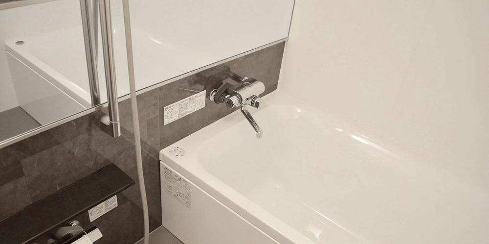 The bathroom has a separate bathtub and washing area. The large bathtub can accommodate two people.